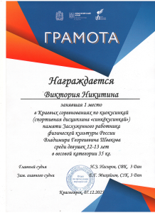 Никитина Виктория, возрастная категория 12-13 лет, весовая категория 35 кг. – 1 место